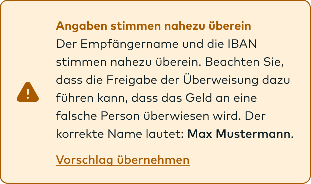- Erscheint die Meldung „Angaben stimmen nahezu überein“, gibt es eine kleine Abweichung, zum Beispiel einen Tippfehler oder Zahlendreher. Dir wird dann der Name der Kontoinhaberin oder des Kontoinhabers mit der von dir angegebenen IBAN angezeigt. Ist der vorgeschlagene Name korrekt, kannst du die Überweisung beruhigt freigeben. Bist du dir nicht sicher, gib die Überweisung lieber nicht frei – andernfalls könntest du das Geld an eine falsche Person überweisen.