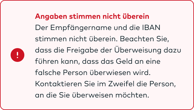 - Du kannst die Überweisung trotzdem freigeben – mit dem Risiko, dass das Geld an eine falsche Person überwiesen werden könnte