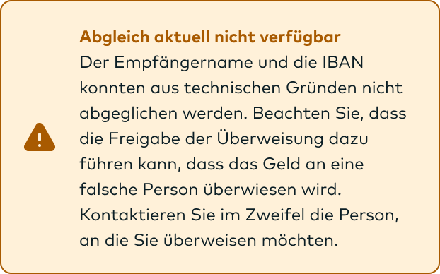 - Ein Abgleich zwischen Name und IBAN der Empfängerin oder des Empfängers ist aus technischen oder anderen Gründen nicht möglich